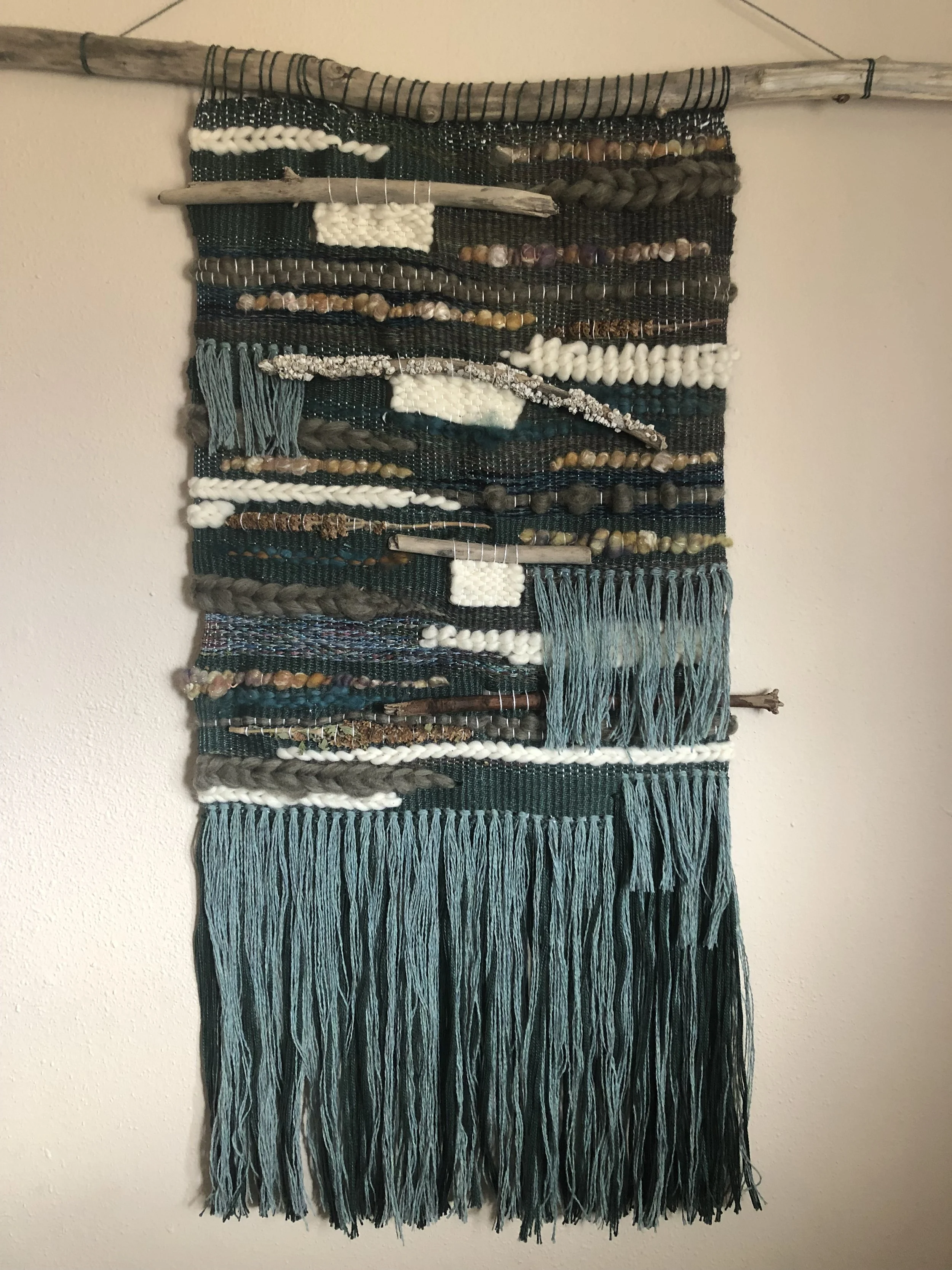 Mixed-media weaving. found driftwood, upcycled and handspun wool, cotton, acrylic accents. NFS.