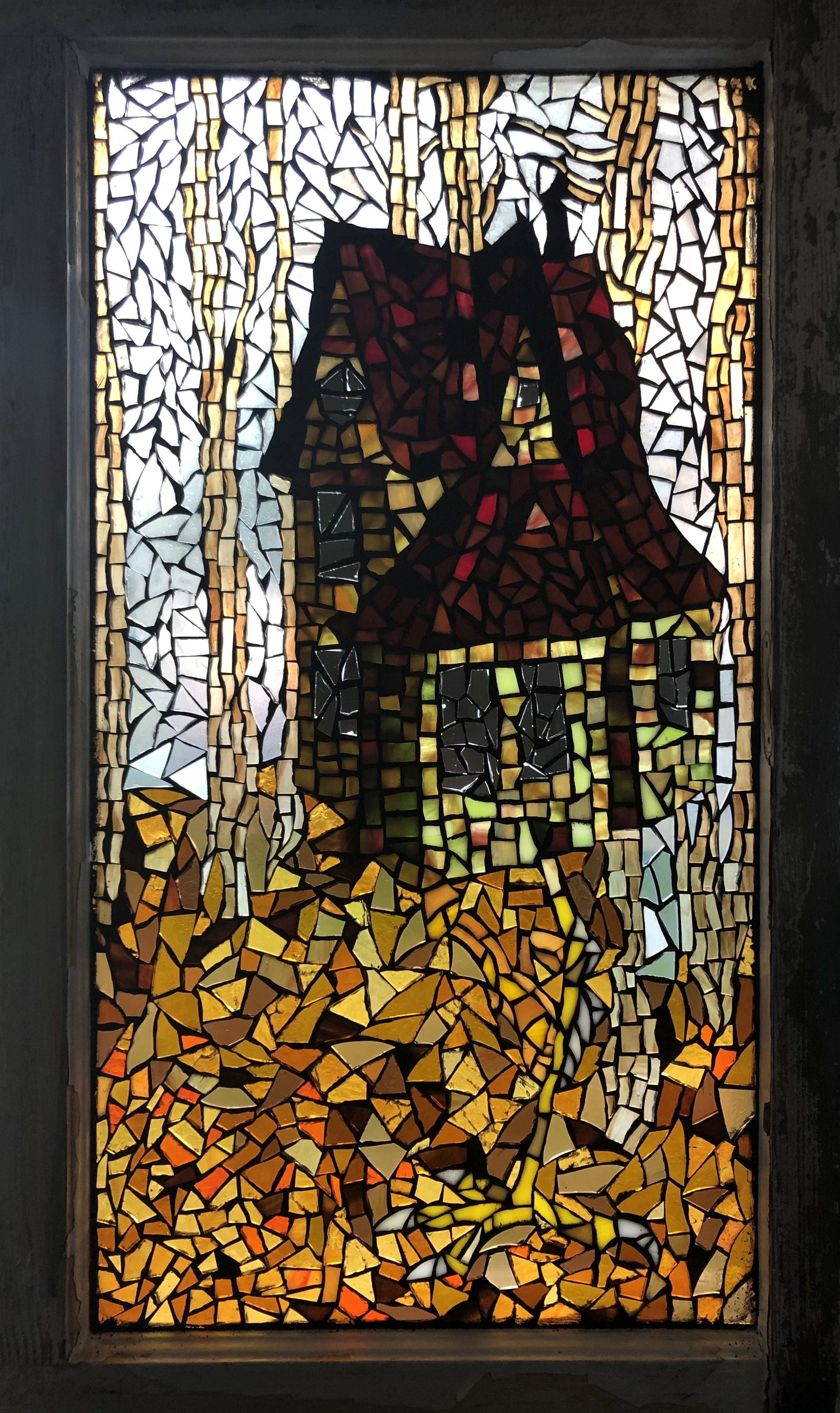 Glass-on-glass mosaic. Stained glass on upcycled window sash.