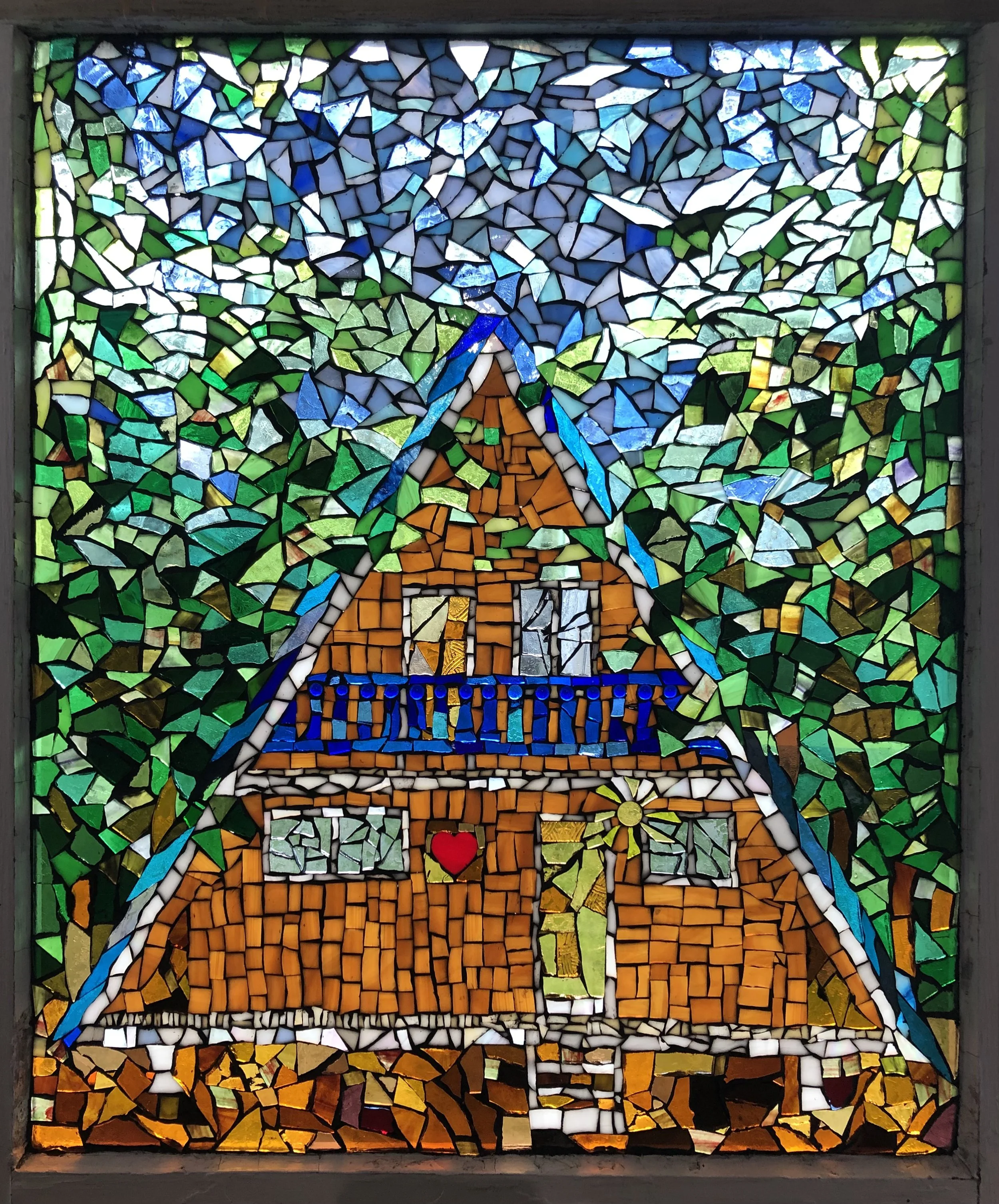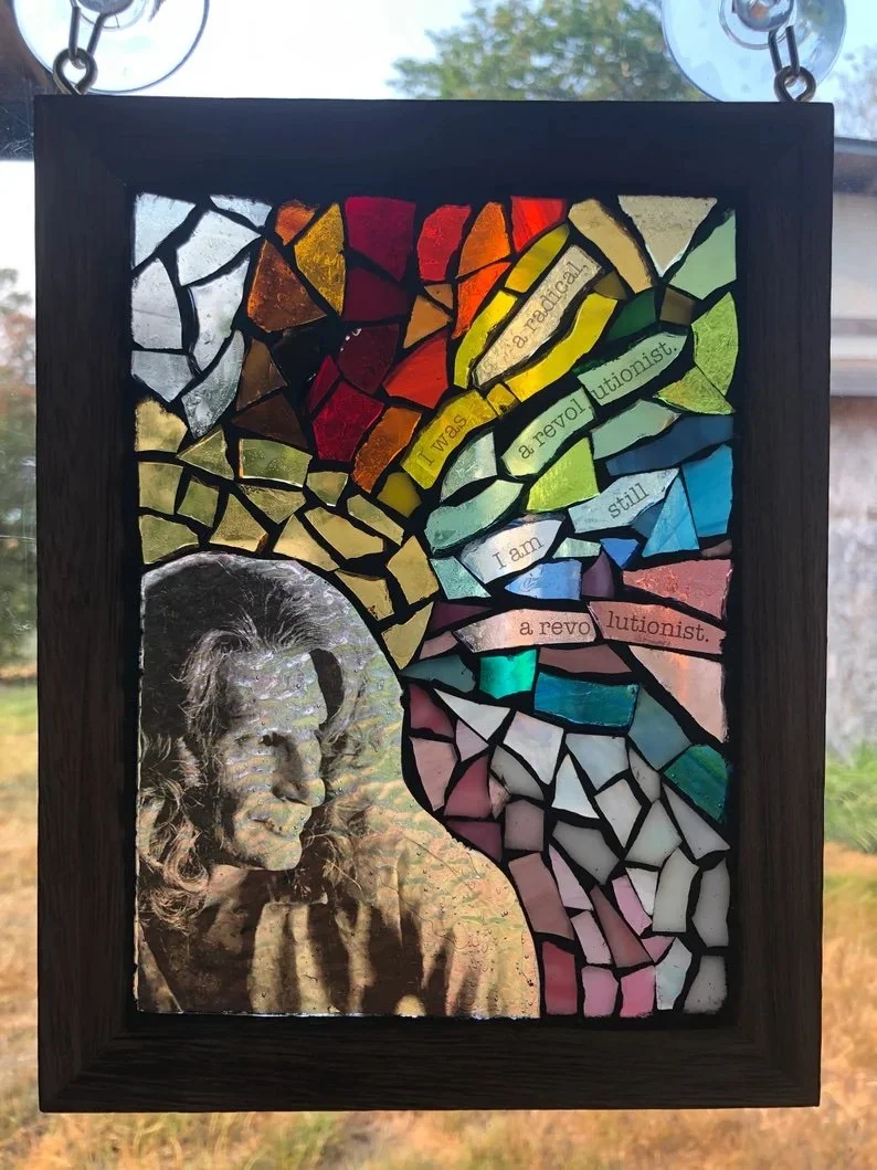 Glass-on-glass mosaic with stained glass on upcycled window. Original NFS, prints available through Fine Art America